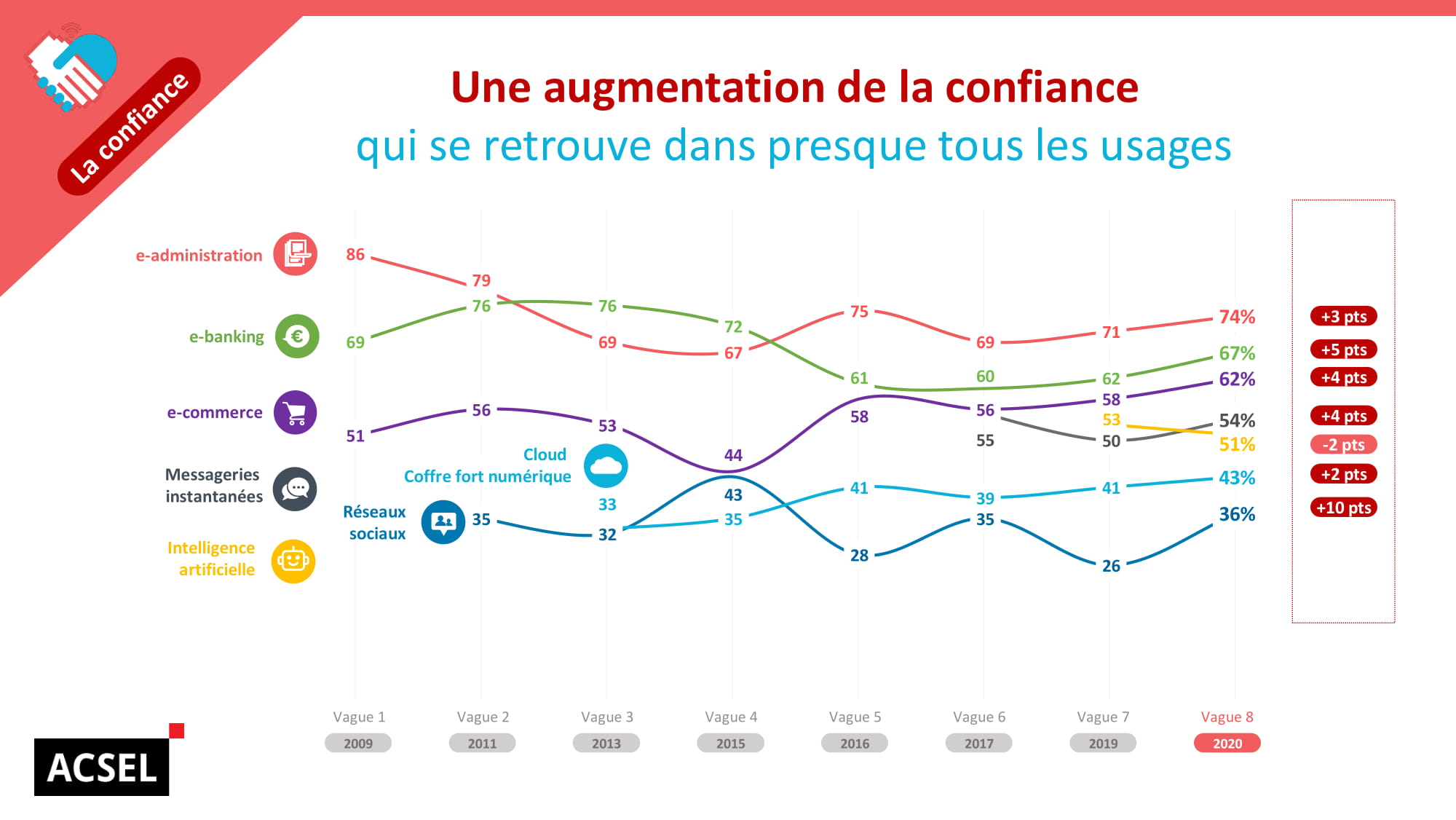 Cette hausse du recours au digital pendant la crise a permis d’augmenter la confiance que portent les Français envers le numérique (+5 points par rapport à 2019). L’ACSEL indique que la confiance des Français n’avait pas été aussi haute depuis 2015. On constate une hausse de la confiance pour tous les usages (sauf l’Intelligence Artificielle).