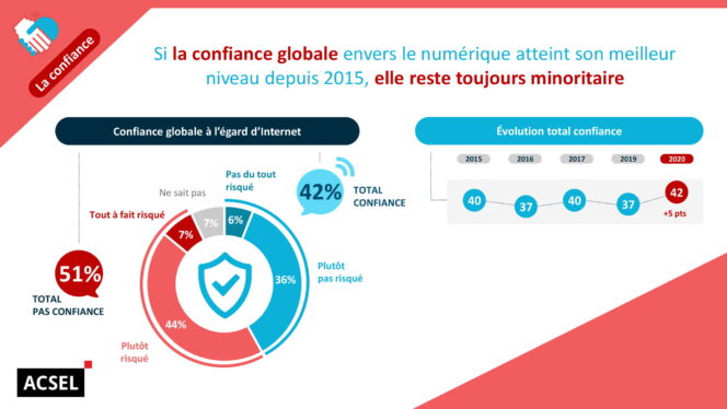 Mais il est important de souligner qu’il y a toujours une majorité des Français (51 %) qui n’ont pas confiance à l’égard d’Internet, dont 44 % qui perçoivent l’usage d’Internet comme « plutôt risqué » et 7 % comme « tout à fait risqué ».