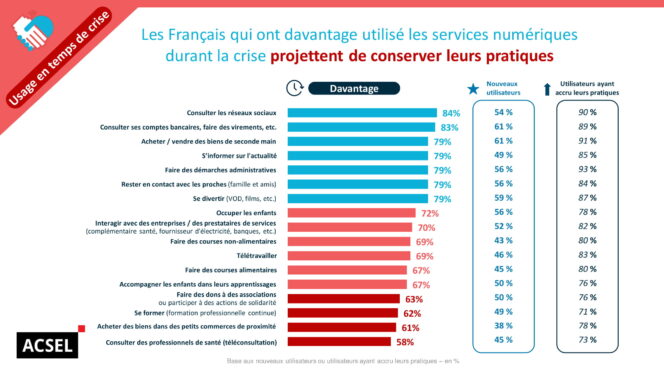 Le développement de l’usage du numérique devrait être durable car les Français, qui ont dû avoir recours aux services en ligne durant la crise, devraient conserver ces pratiques. On constate notamment que, depuis la fin du premier confinement, 84 % d’entre eux ont davantage recours à Internet, à la fois pour leur usage personnel et professionnel.
