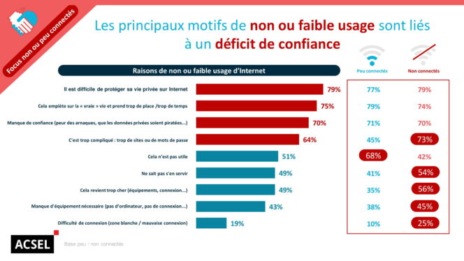 Dans son étude, l’ACSEL se penche aussi sur la confiance des Français qui sont « peu ou non connectés ». De ce côté-là, pas de grand changement significatif malgré un contexte inédit de crise, seuls 12 % d’entre eux ont souhaité utiliser davantage Internet. La raison principale de leur faible utilisation des services en ligne est la suivante : « il est difficile de protéger sa vie privée sur Internet » (79 %).