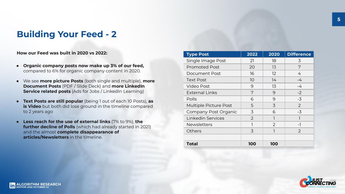 Le rapport réalisé par Richard van der Blom montre des changements de l’algorithme LinkedIn, survenus depuis septembre 2022 :