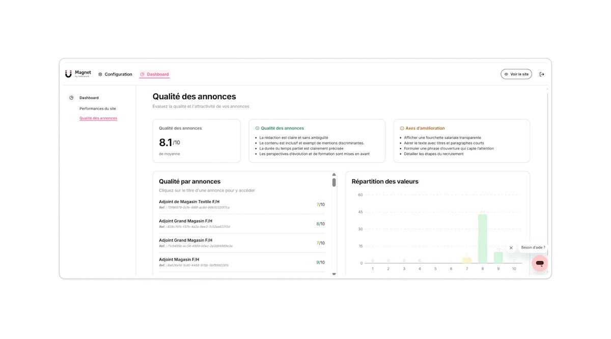 Look at my Ad, c’est son nom, accompagne les recruteurs dans une tâche cruciale pour attirer les candidats : l’optimisation des offres de leurs emplois. Enrichie par l’IA et, surtout, nourrie de l’expertise d’Hellowork (éditeur du BDM, ndlr), qui héberge et diffuse plus de 10 millions d’annonces chaque année, la fonctionnalité attribue un score à chaque offre. Elle évalue sa qualité rédactionnelle, identifie ses atouts, ses zones floues, signale ses éventuelles lacunes — absence de fourchette salariale, manque de transparence sur les étapes de recrutement — puis propose des axes d’amélioration.