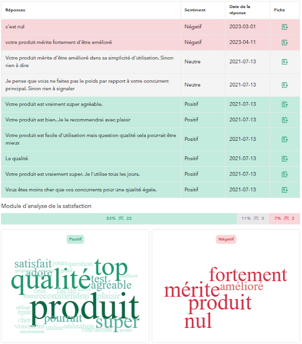 L’agent IA de Drag’n Survey intègre une analyse de sentiment automatique qui classe les commentaires selon leur tonalité : positive, négative ou neutre. Cette première catégorisation permet d’identifier rapidement les points de satisfaction et les sources de frustration, sans avoir à lire l’intégralité des réponses. La synthèse intelligente des données va plus loin en extrayant les thématiques récurrentes, en regroupant les commentaires similaires et en hiérarchisant les insights selon leur fréquence d’apparition.