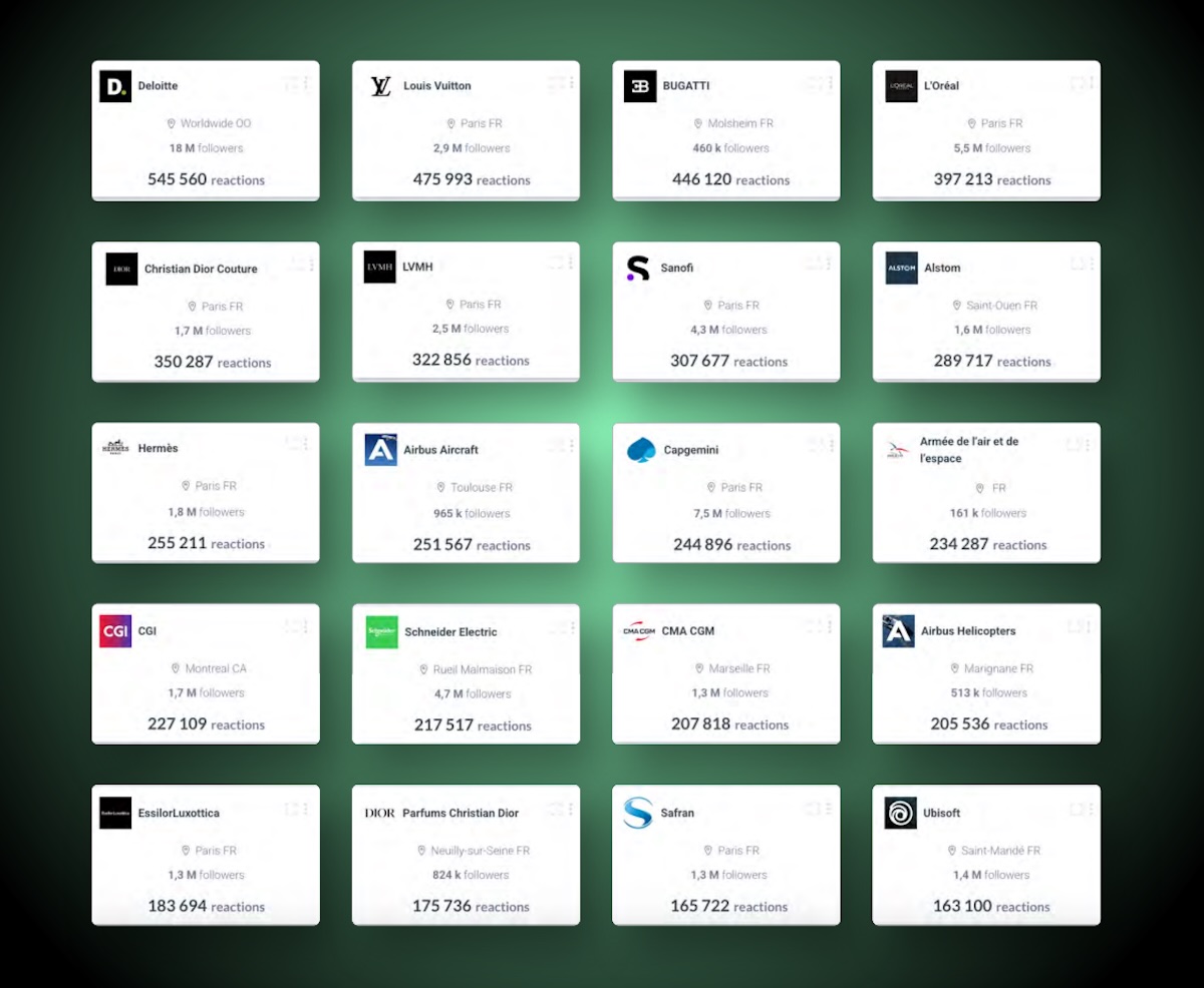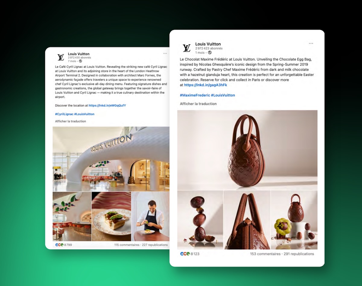 Étonnamment, malgré le positionnement moins visuel du réseau social, « l’industrie du luxe occupe une place prédominante parmi les entreprises les plus influentes sur LinkedIn », annonce Visibrain. Entre avril 2024 et avril 2025, de nombreuses maisons de luxe se distinguent par un fort taux d’engagement : Christian Dior Couture (350 000 réactions), LVMH (323 000 réactions), Hermès (255 000 réactions) figurent parmi les entreprises les plus influentes sur le LinkedIn francophone. Tout comme Louis Vuitton (457 000 réactions) que Visibrain catégorise parmi les « best cases » sur LinkedIn, pour sa stratégie mêlant luxe et pâtisserie et incluant des collaborations avec Maxime Frédéric ou Cyril Lignac.