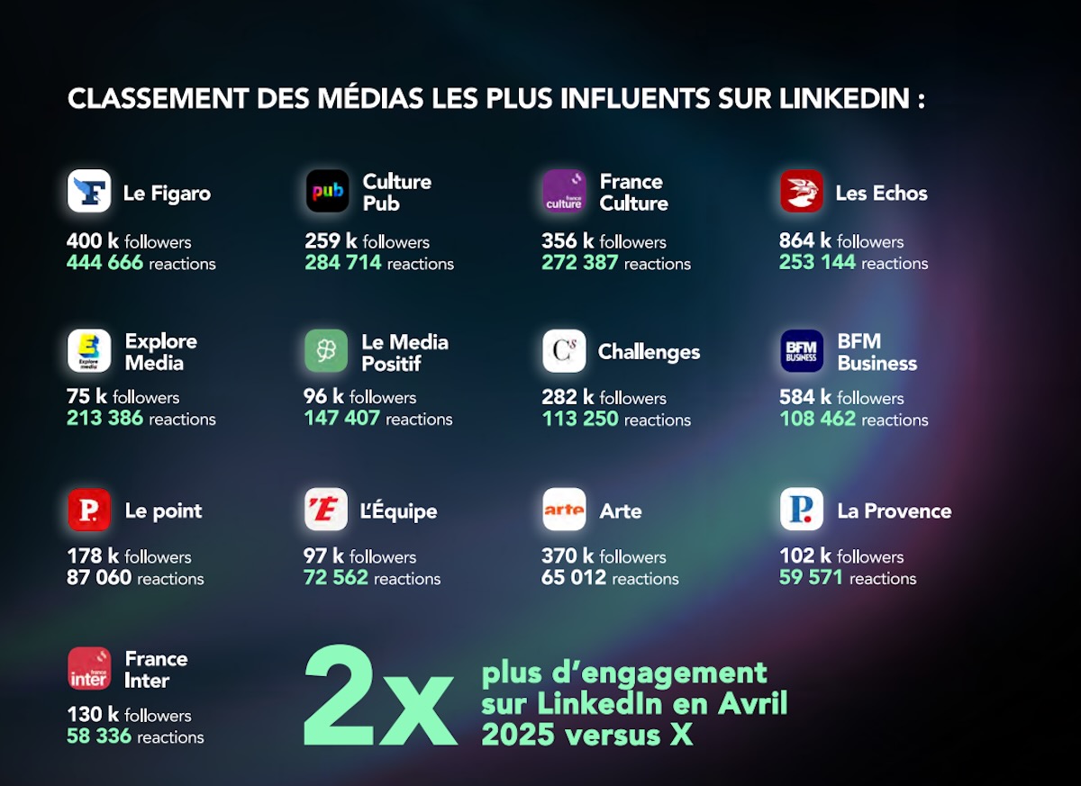 Dans le même temps, le chaos régnant sur X a également conduit de nombreux médias à se tourner vers LinkedIn, considéré comme « un environnement moins crisogène » et mieux à même de « toucher des audiences qualitatives ». Un pari qui semble payant, puisque les médias les plus influents sur la plateforme, de Culture Pub à Challenges en passant par Le Figaro ou ARTE, enregistrent « des volumes d’engagement largement supérieurs à X », souligne Visibrain. « Nombreux sont ceux à adopter une ligne éditoriale positive sur LinkedIn, en opposition avec les usages sur X. Vert, le média met ainsi en avant des actualités porteuses d’espoir, comme la libération de Paul Watson, tandis qu’ARTE valorise ses succès, en partageant par exemple un record d’audience », complète l’étude.