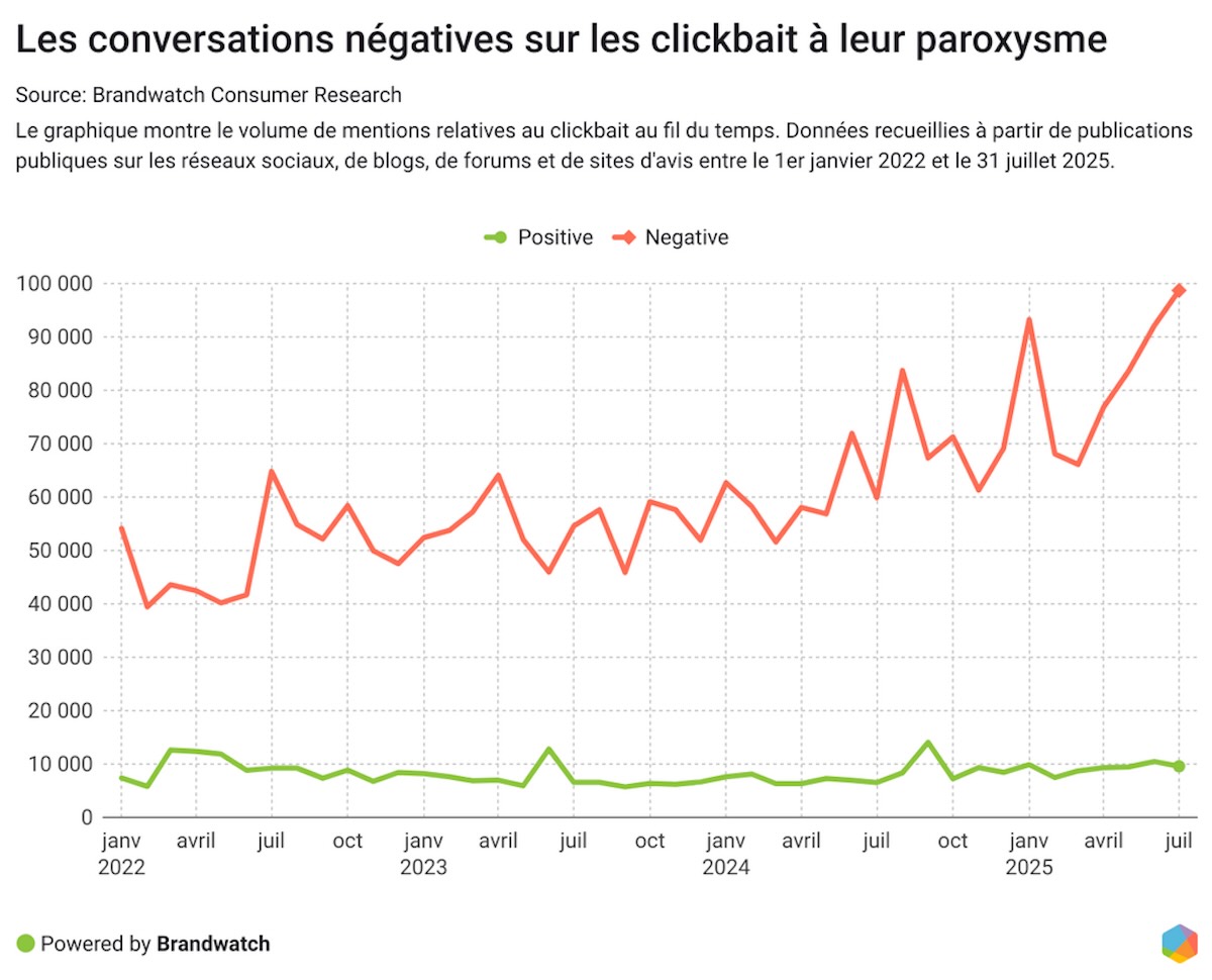 Cela ne surprendra sans doute personne, mais 54 % des discussions en ligne liées à la publicité « expriment de la colère » sur la période étudiée. Le clickbait, « longtemps une tactique de référence pour capter l’attention », resitue Brandwatch, suscite particulièrement de la frustration : 90 % des mentions y faisant référence sur les plateformes sont négatives. La raison à cela risque difficilement de vous étonner : lorsqu’un utilisateur clique sur une promesse trompeuse, il se sent manipulé. L’expérience entame la confiance, et réduit durablement son envie d’interagir avec la marque dans le futur, indique l’éditeur.