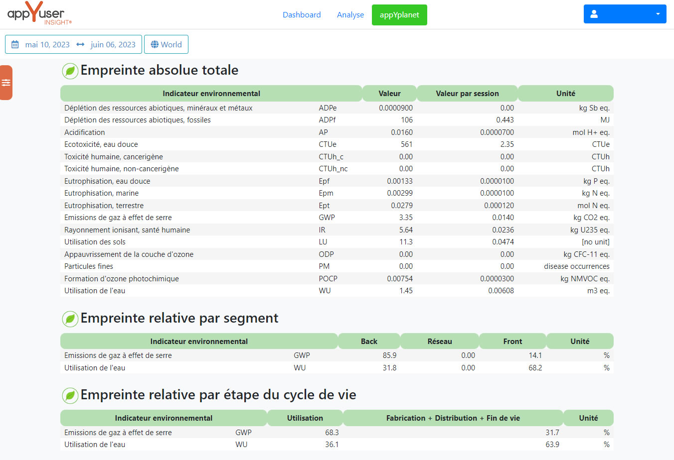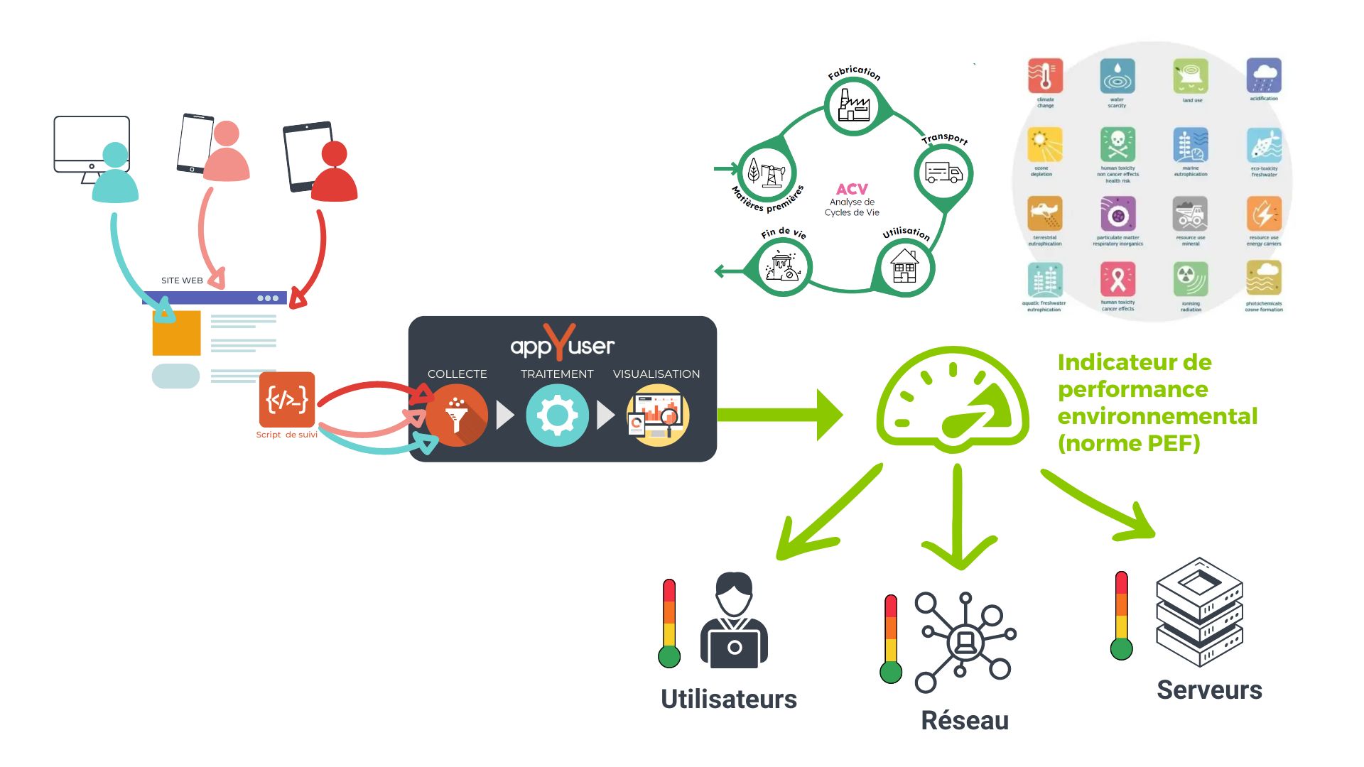 En collaboration avec les spécialistes du numérique durable tels que Resilio, startup de l’EPFL (École Polytechnique Fédérale de Lausanne) et membre du collectif GreenIT, appYuser a conçu un indicateur de performance environnementale pondérant 16 types d’impacts différents (émissions de GES, utilisation d’eau, consommation d’énergie, épuisement des ressources, etc.) calculés sur l’ensemble du cycle de vie (du site, des appareils), permettant à tous les professionnels impliqués dans un projet web de piloter simplement et efficacement l’empreinte écologique de leurs sites.