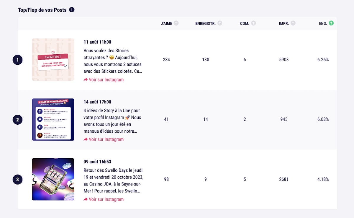 Swello propose des tableaux de bord simples et complets, dédiés aux pages LinkedIn, avec une vue d’ensemble par période, une répartition par format et une identification des meilleurs et pires posts. Cette visualisation permet de repérer les tendances. Si les carrousels génèrent plus d’impressions mais que les photos suscitent davantage d’engagement, il peut être pertinent de rééquilibrer sa stratégie de contenu.