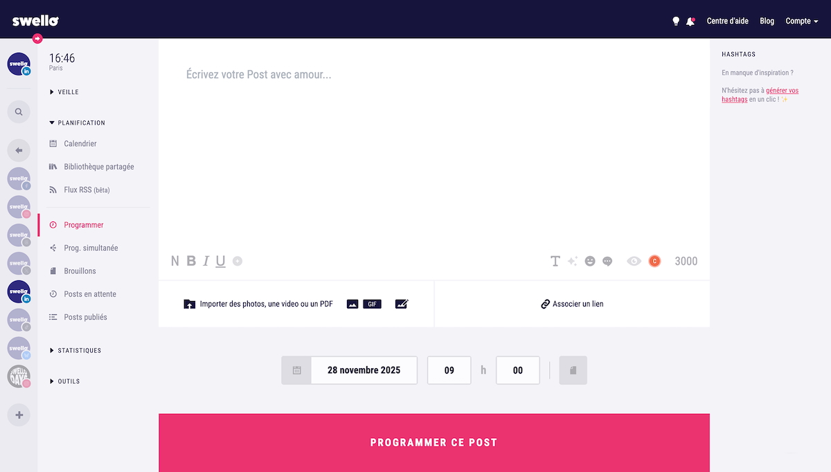 Swello permet de planifier ses posts LinkedIn, aussi bien sur les profils personnels que sur les pages entreprise. L’outil prend en charge jusqu’à 3 000 caractères par publication, ce qui laisse la possibilité de construire des contenus narratifs et engageants. D’autres fonctionnalités permettant de booster sa visibilité sont également disponibles : programmation de carrousel, ajout du premier commentaire, remplissage de la balise alternative via l’IA… La vue calendrier offre une vision globale des publications programmées, ce qui facilite l’organisation éditoriale sur plusieurs semaines.