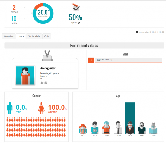 Une fois le concours lancé, vous avez accès au suivi de votre campagne. Vous pourrez notamment voir combien de personnes participent mais aussi avoir accès aux premières données : sexe, adresse, clients mail, age… Le tout est présenté dans des graphiques particulièrement détaillés.