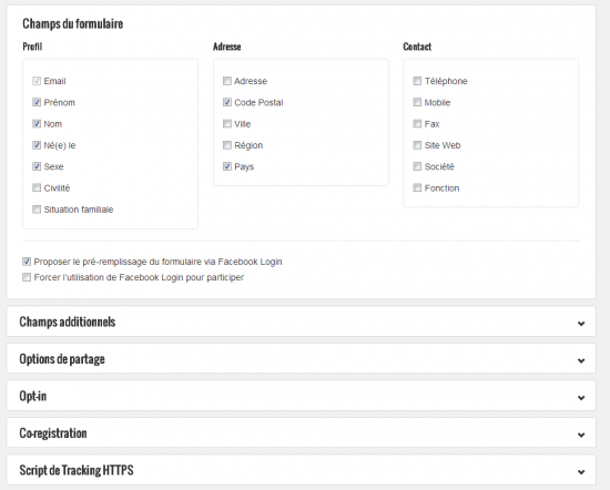On touche le point primordial d’un concours Facebook : l’acquisition de données sur les participants. Les options proposées sont multiples : email, prénom, nom, date de naissance, sexe, adresse… des champs personnalisés sont d’ailleurs possibles. Le remplissage de ces données peut se faire via le Facebook Login ou manuellement par le joueur.