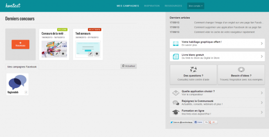 Pour vous connecter à Kontest, il suffit de passer par une connexion Facebook Login. Une fois connecté, vous aurez accès à votre dashboard Kontest qui permet d’accéder à vos campagnes en cours et de créer de nouveaux concours. L’interface est épurée et permet d’accéder facilement aux infos essentielles. Vous pourrez aussi demander de l’aide via une fenêtre dédiée en bas de l’écran. Toujours pratiques si vous avez un problème dans le déploiement de votre concours. Vous aurez aussi accès aux dernières informations ainsi qu’à des exemples de concours. Pratique si vous manquez d’inspiration !
