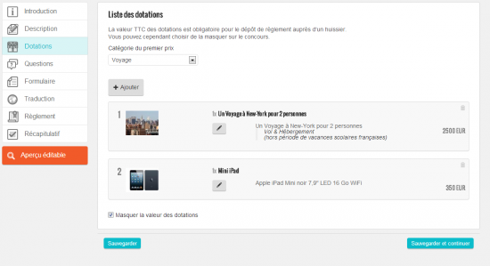 Évidemment il faut aussi renseigner le prix à gagner pour le concours, ici un voyage et un iPad. Rien de plus simple, il suffit d’ajouter le lot, sa valeur ainsi qu’une image et la description. Si plusieurs prix sont à gagner vous pouvez en ajouter autant que nécessaire.