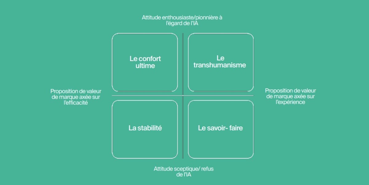 Pour y voir plus clair et aider les marques à sérier les opportunités, nous avons conçu une matrice à la manière du Boston Consulting Group. Nous avons croisé les comportements en abscisses (de prudent à enthousiaste), et les propositions de valeur en ordonnées (orienté efficacité ou exploration humaine) pour isoler quatre grands quadrants : les transhumanistes, les pragmatiques, les sceptiques et les artisans. Pour chacun des quadrants, nous avons développé plusieurs pistes de réflexion afin de nourrir leur storytelling.
