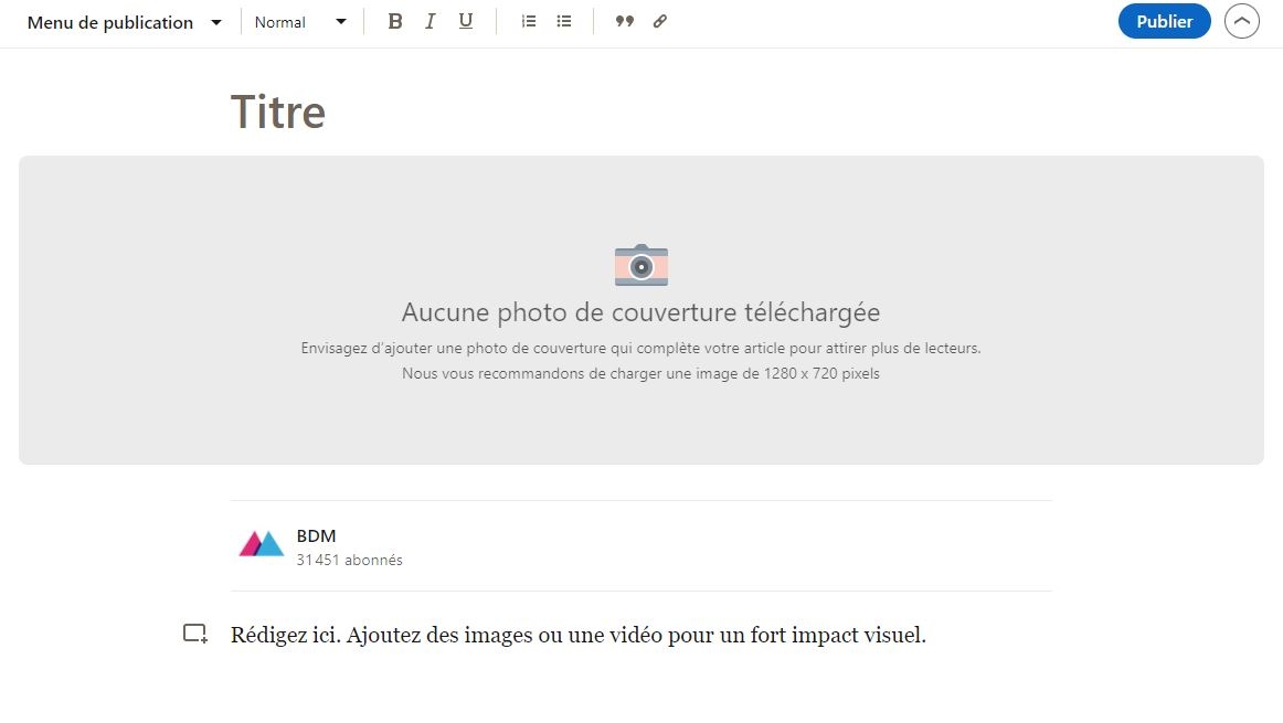 - La photo de couverture de votre article, la légende et le crédit : le format de l’image recommandé par LinkedIn est de 1280×720 pixels,
