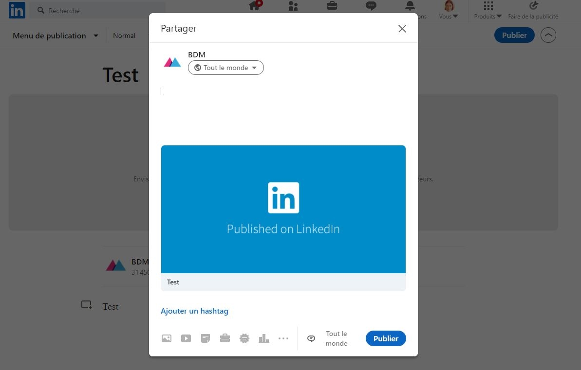 Vous pouvez agrémenter le partage de votre article en y ajoutant un ou plusieurs hashtags, et sélectionner qui peut commenter votre post de publication (Tout le monde ou Personne), en bas à gauche du bouton de publication. Lorsque vous êtes prêt, cliquez une nouvelle fois sur l’icône Publier. N’hésitez pas à copier le lien de votre article pour le partager sur vos différents réseaux sociaux, et partagez-le sur votre profil personnel sur LinkedIn afin d’augmenter sa visibilité.