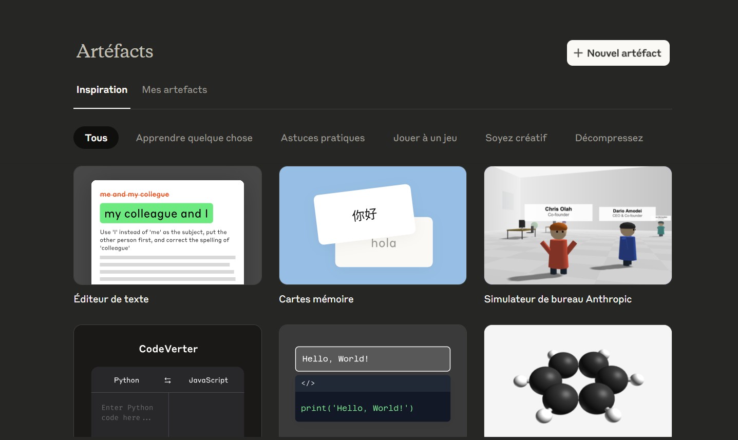 Initialement, les Artefacts ne disposaient d’aucun espace dédié. C’est chose faite depuis juin 2025. Celui-ci se trouve dans le menu à gauche de l’interface. Vous pourrez y trouver des sources d’inspiration ainsi que la liste des Artefacts que vous avez conçus. Un bouton « Nouvel Artefact » vous offre également la possibilité de lancer un nouveau projet.