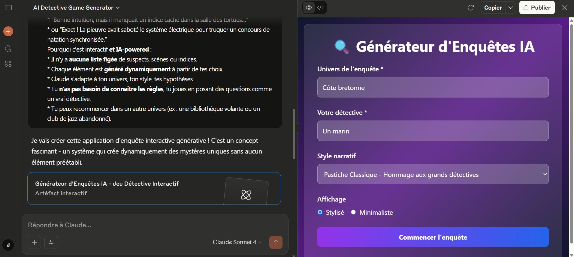 Si le jeu d’enquête vous intéresse, vous pouvez y accéder ci-dessous. En revanche, il vous faudra un compte Claude pour pouvoir y jouer. Par ailleurs, ce sont les crédits de l’utilisateur (et non ceux du concepteur du jeu) qui sont utilisés à chaque prompt.
