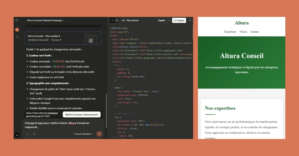 Les Artefacts facilitent la création d’un site de A à Z. Mais peuvent-ils vous aider à améliorer votre code déjà existant ? Dans l’exemple ci-dessous, nous lui transmettons un fichier source d’un site créé pour l’agence fictive Altura Conseil. Nous demandons à Claude quelques modifications.