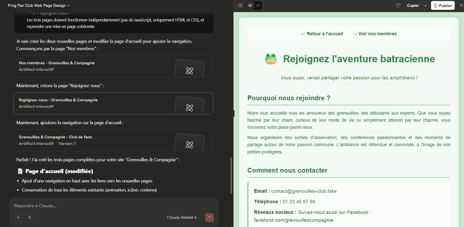 Ici, Claude crée deux nouveaux Artefacts : un pour chaque page. Les nouvelles pages créées respectent la demande, même si Claude se permet quelques ajouts personnels.