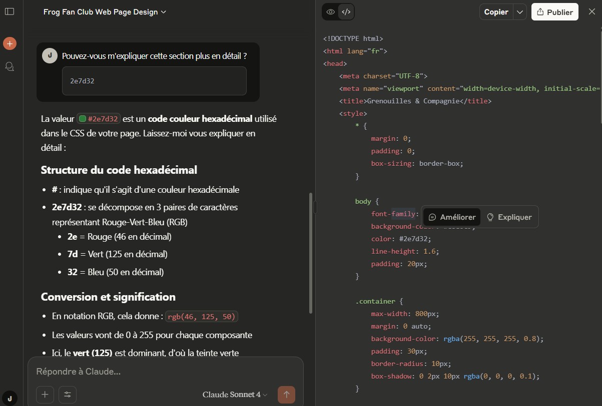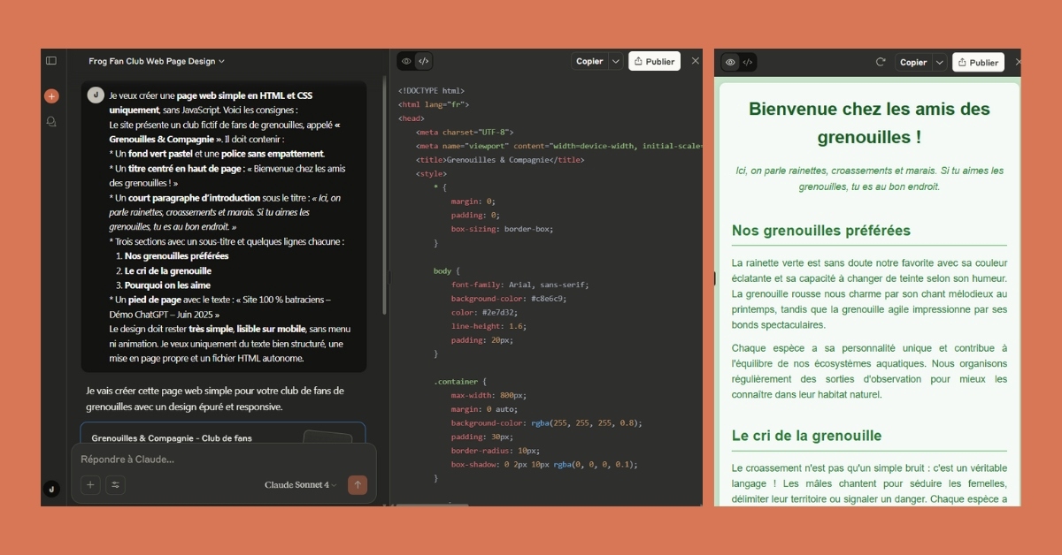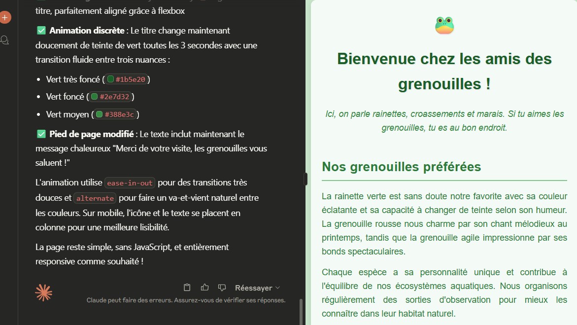 À nouveau, Claude ouvre naturellement un Artefact et intègre les modifications demandées. Il est possible d’exporter le rendu au format HTML ou de poursuivre les modifications.