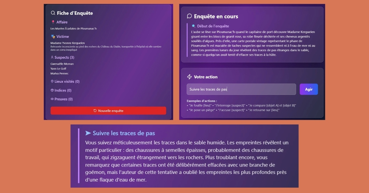 Dans l’exemple ci-dessous, nous concevons un jeu d’enquête. L’IA permettra à l’utilisateur de personnaliser entièrement l’univers du jeu. Après quelques modifications, notre jeu est prêt.