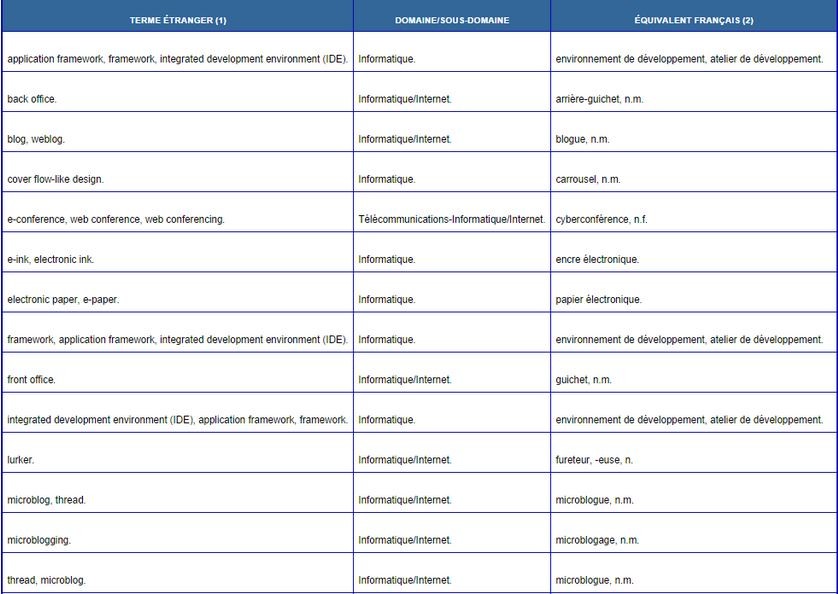 Pour préserver la langue de Molière des incursions anglophones, La commission générale de terminologie et de néologie publie régulièrement une liste de traductions françaises des termes relatifs au web ou à l’informatique. Sachant que le web est envahi de termes anglais (un état de fait normal étant donné la nature même d’Internet) la commission a un travail important. Mais la plupart des termes sont quasiment impossible à traduire de façon décente. Les propositions de la commission sont donc particulièrement ridicules dans la plupart des cas. La dernière liste de « vocabulaire de l’informatique et de l’internet » publiée par le commission dans le Journal Officiel ne déroge pas à la règle avec de nouvelles traductions épiques. Encore une fois la commission nous a réservé quelques pépites. On ne doit plus dire Thumbnails mais « imagettes » et « arrière-guichet » au lieu de back office. Oui vous avez bien lu… C’est tout de même rassurant de savoir que la commission n’est pas payée pour ses traductions. Les dernières recommandations sont compilées dans ce tableau, ou sur le site du Journal Officiel.