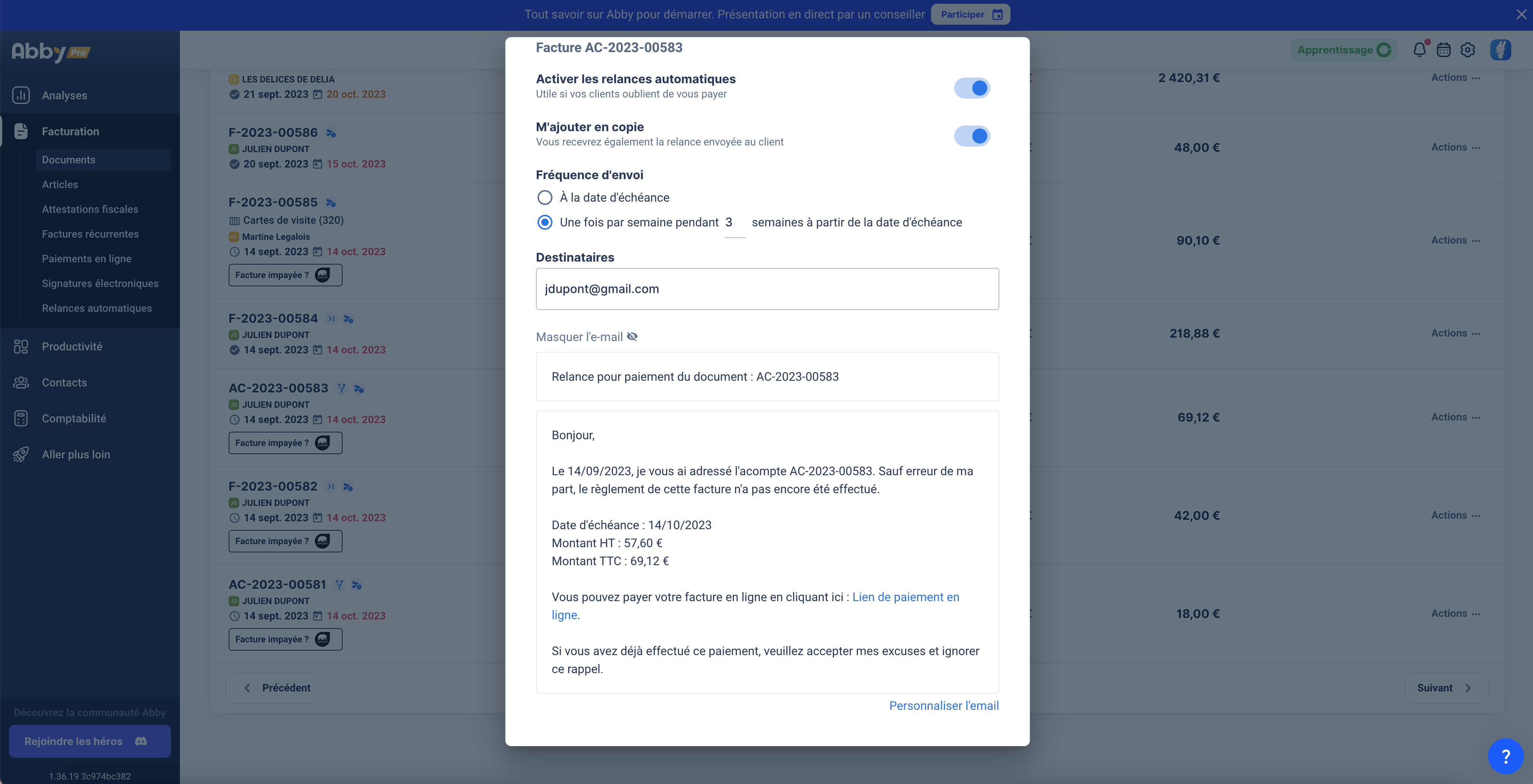 Sur Abby, les utilisateurs ont la possibilité de créer des mails de relance qui sont envoyés automatiquement avec un lien de paiement en ligne en cas de facture en retard. Plus besoin donc de courir après les clients. Cela peut sembler un gain de productivité anecdotique, mais sur une échelle annuelle, le temps économisé est énorme.