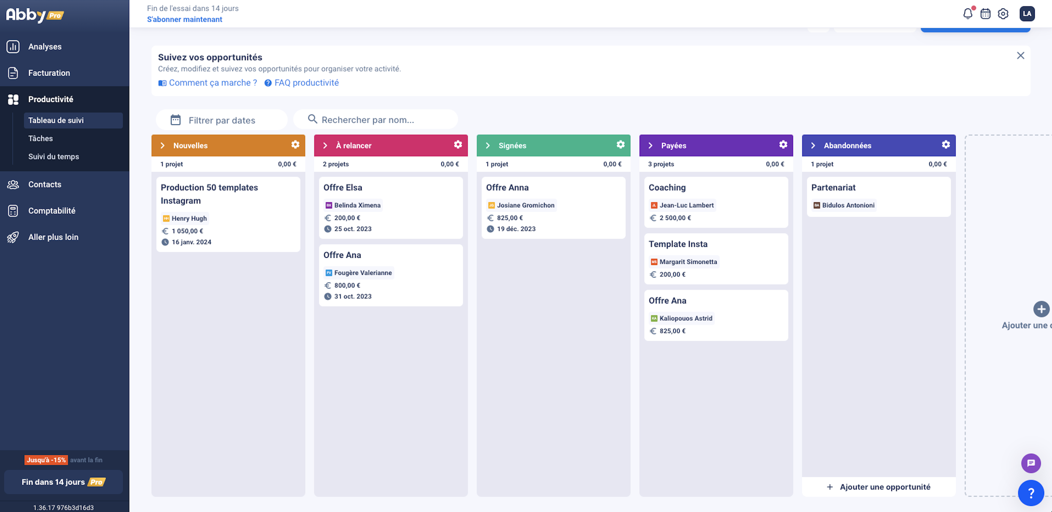 Pas toujours facile de rester vigilant sur cet aspect de l’activité qui est pourtant primordial : vos prospects actuels sont vos futurs clients. Pour vous assurer un maximum d’organisation, et gagner du temps dans le suivi de vos échanges et propositions en cours, vous devrez là encore vous appuyer sur les bons outils. Abby permet notamment un suivi de toutes ces opportunités de façon centralisée. Un excellent moyen de suivre de près vos prospects et de les convertir plus facilement en clients.