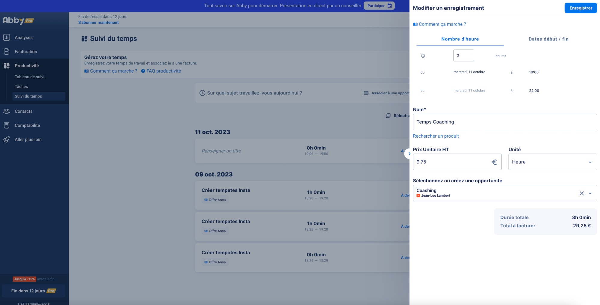 Pour valoriser le plus justement vos missions, il est aussi très important de savoir précisément quel temps vous passez sur chaque tâche. Il est très facile (et fréquent) de sous-estimer le temps passé sur chaque action, et de sous-facturer à votre client votre temps de travail effectif. Pour avoir une vision précise sur vos actions, il est important d’utiliser un bon outil de gestion. Abby intègre par exemple une fonctionnalité de time tracking qui permet d’enclencher un chronomètre pour chaque client et/ou tâche. Cela permet d’avoir une vision très claire du temps passé sur chaque projet. Bien sûr, le temps écoulé permet de générer une facture automatiquement à la fin de la mission.