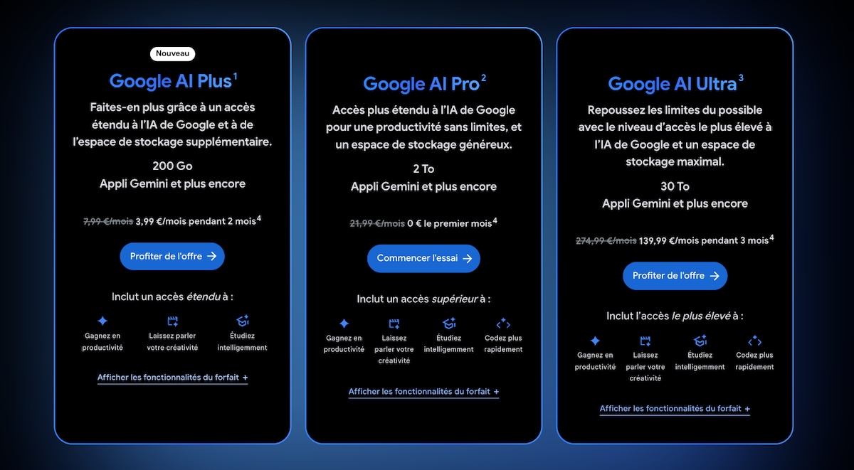 Ces derniers mois, Google a étoffé son offre pour répondre aux besoins variés des utilisateurs de Gemini, son agent conversationnel. Avec le lancement récent de Google AI Plus, la firme de Mountain View propose désormais quatre formules distinctes, de l’accès gratuit à l’abonnement Ultra à près de 275 euros par mois. Vous envisagez de souscrire une formule payante, mais vous peinez à vous y retrouver ? Voici un tour d’horizon des fonctionnalités, tarifs et limites de chaque offre.