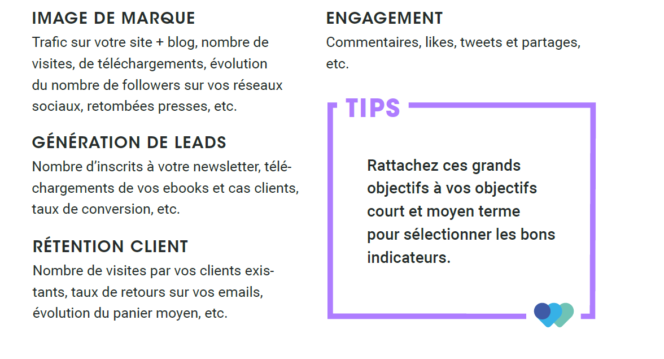 - Limiter le nombre d’indicateurs, préférer un indicateur clé à d’autres metrics annexes.
