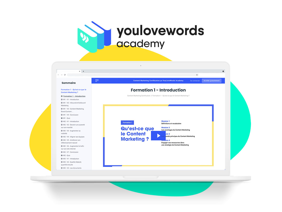 Cette stratégie axée sur le contenu est de plus en plus commune, mais souvent partiellement ou mal maîtrisée. C’est pourquoi YouLoveWords, leader du Content Marketing, lance la YouLoveWords Academy avec une première certification gratuite et 100 % en ligne pour vous former et valider vos compétences dans ce domaine.