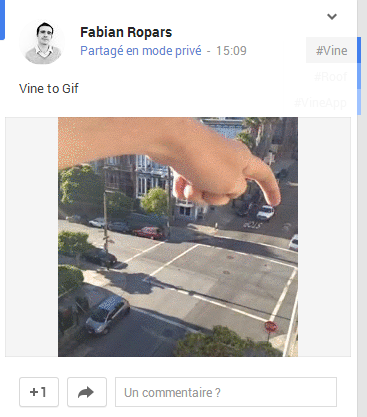 Pour convertir votre Vine, il suffit d’entrer son URL dans le champ dédié. Une fois la conversion effectuée, un simple clic droit – enregistrer sous et le GIF est en votre possession. Voilà, vous pouvez maintenant inonder vos contacts de vidéos Vine converties en GIF ! Voici par exemple ce que donne l’intégration du Vine originel sur Google+ :