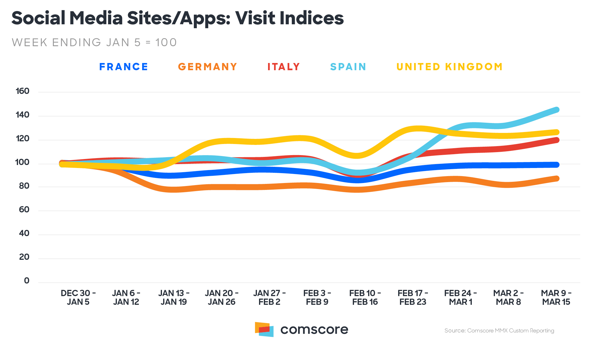 Une étude menée par Comscore montre de nettes variations dans le comportement des consommateurs, à travers 5 thématiques : les visites de sites ou d’applications d’actualités, le trafic vers les sites de billetterie, des agences de voyages ou de e-commerce, ainsi que l’usage des réseaux sociaux. Les données fournies par Comscore concernent la période entre le 30 décembre 2019 et le 15 mars 2020, et ciblent les 5 pays européens les plus touchés par la pandémie du Coronavirus : la France, l’Allemagne, l’Italie, l’Espagne et le Royaume-Uni.