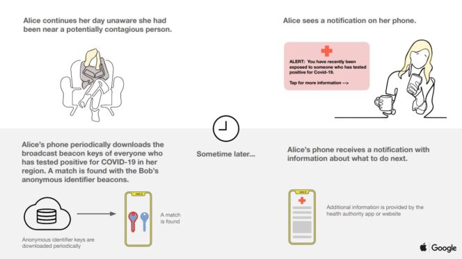 Concrètement, lorsque deux utilisateurs ou plus entreront en contact physique, leurs téléphones utiliseront le BLE pour transmettre un identifiant aléatoire et anonyme aux appareils situés à proximité. Ces identifiants changeront toutes les 15 minutes pour empêcher le suivi sans fil d’un appareil. Lorsqu’une personne infectée signalera au système qu’elle a été testée positive, son téléphone contactera un serveur central et téléchargera ses identifiants au cours des 14 derniers jours. Les utilisateurs non infectés chargeront des clés de suivi quotidiennes, qui leur permettront de savoir si elles sont entrées en contact avec les patients atteints du virus.
