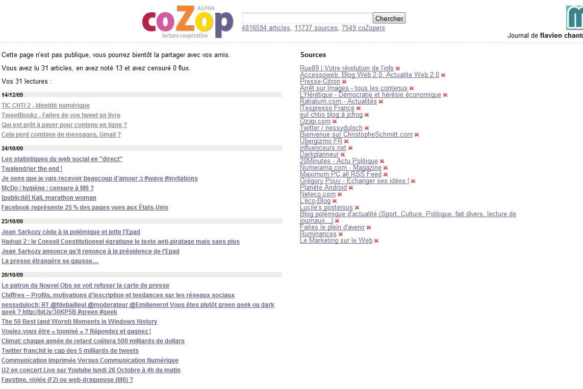 L’information est devenue instantanée, jetable, souvent vide de sens. Le bruit est tel (notamment sur Twitter) que la hiérarchisation est devenue compliquée. Ne parlons pas de Facebook où le personnel s’immisce dans les conversations, rendant les autres types de contenus encore plus noyés dans la masse. Certes, la propagation de l’information est plus rapide que jamais. Mais sa durée de vie aussi. Dans ce contexte, comment faire pour ne pas se disperser ? Pour obtenir le contenu qui nous intéresse ? Pour ne pas perdre son temps ? Plutôt qu’un récapitulatif, j’ai choisi de mettre en avant quelques services qui méritent qu’on s’y attarde. Je commence avec mon coup de cœur de l’année : Cozop. Cet outil met le doigt là où il faut, hiérarchisant les contenus et vous apportant chaque jour un condensé de ce que vous devez lire. Rien de révolutionnaire, de bling-bling ou de hype, juste un site qui vous fait gagner du temps et qui apporte du sens.
