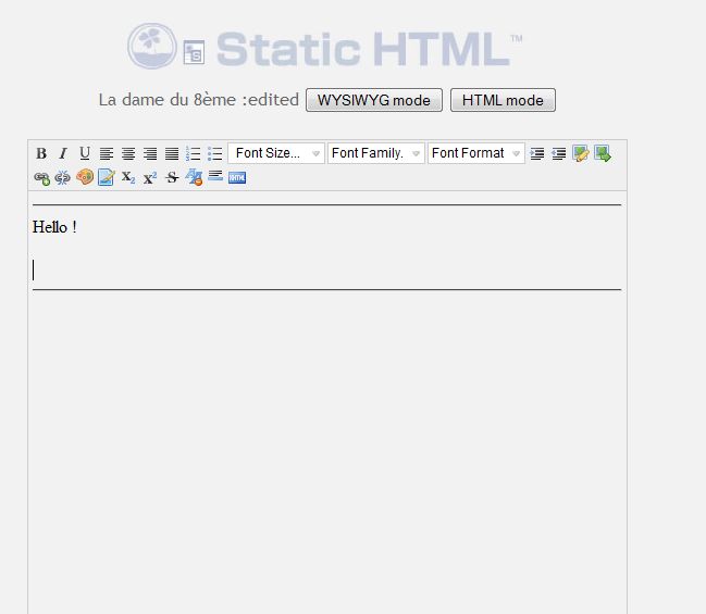 Un nouvel onglet a été créé sur votre page fan, intitulé « Static HTML » : vous pouvez l’éditer en cliquant sur le bouton prévu à cet effet. Le fonctionnement de Static HTML est un peu bizarre à ce niveau, puisque vous pouvez également modifier vos onglets à partir de la page d’accueil de l’application. Pas très intuitif ! Enfin, vous finirez par parvenir à l’édition de l’onglet à proprement parler. Là, tout devient tout de suite plus clair ! Choisissez le mode « WYSIWYG » pour accéder à l’outil d’édition simple – sinon, vous pouvez toujours opter pour le mode HTML. Et là, l’interface est très simple, si vous avez un blog cela ne sera pas trop dépaysant.