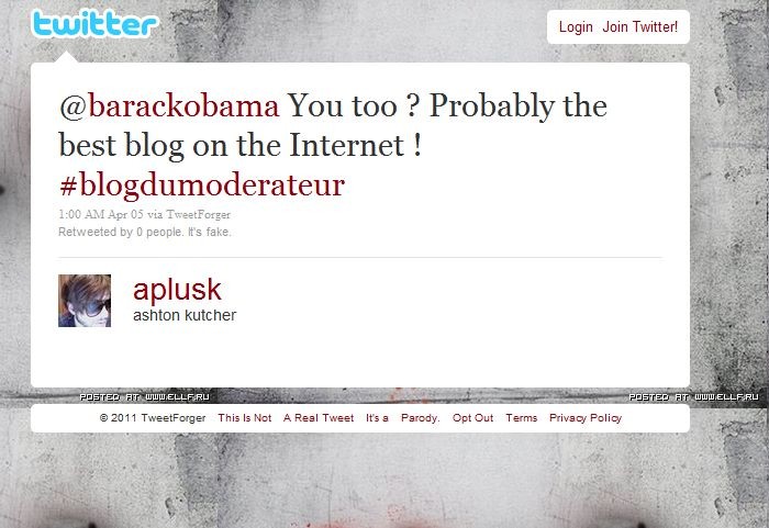 Vous aimeriez que Barack Obama en personne déclare que votre blog est le meilleur du monde ? Ou bien qu’Ashton Kutcher vante les mérites de votre site ? A condition que la personne visée ait un compte Twitter, c’est désormais possible ! TweetForger est un service qui permet en effet de créer des faux messages Twitter plus vrais que nature, en reprenant toutes les caractéristiques du compte Twitter (avatar, background, personnalisation des couleurs…) que vous souhaitez piéger. L’effet est saisissant ! Il suffit d’indiquer le nom d’utilisateur et le message que vous souhaitez, et TweetForger créera le faux tweet correspondant. Bon, il y a tout de même des indices signifiant que le tweet est faux, et lorsque l’on passe la souris sur le message, la falsification ne fait plus aucun doute. Mais à première vue, c’est à s’y méprendre… Vous pouvez partager vos faux tweets directement sur Twitter, Facebook ou par mail. TweetForger créé également une URL unique pour vos messages. Le potentiel de supercherie est assez énorme !