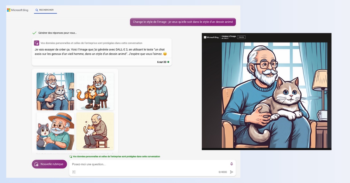 Mais vous pouvez également poursuivre la conversation, et donc la création, avec le chatbot. Nous avons par exemple demandé la même image, mais dans le style d’un dessin animé, à la suite de notre première requête. « Voici l’image que j’ai générée avec DALL-E 3, en utilisant le texte “un chat assis sur les genoux d’un vieil homme, dans un style d’un dessin animé” », nous précise Bing Chat.