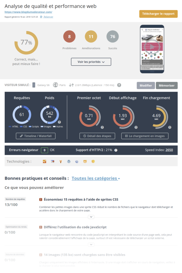 Au “sommaire” de ce rapport (téléchargeable au format PDF), on retrouve ainsi une gamme complète d’indicateurs chiffrés ainsi qu’une multitude d’informations sur la performance et la qualité de la page testée. Pour chaque analyse, Dareboost passe en revue plus d’une centaine de points de contrôle (concernant la performance, mais aussi la qualité, la sécurité, le SEO, etc.). Ce qui permet au service de joindre au rapport une liste de conseils d’optimisation personnalisés, très bien documentés, et classés par ordre d’importance.