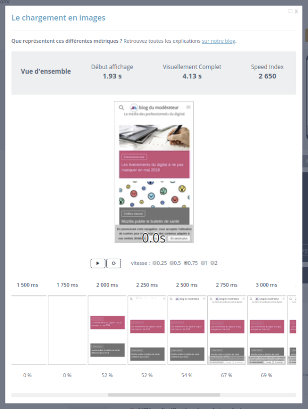 Pour pouvoir calculer et présenter des indicateurs de performance comme le Speed Index, considéré aujourd’hui comme le plus révélateur de l’expérience utilisateur, les sondes de test Dareboost enregistrent une vidéo du chargement de la page qui est ensuite proposée en replay sur chaque rapport d’analyse (accompagnée d’un filmstrip décomposant le chargement image par image). Grâce à cette fonctionnalité, on se rend facilement compte des implications UX de la vitesse de chargement.