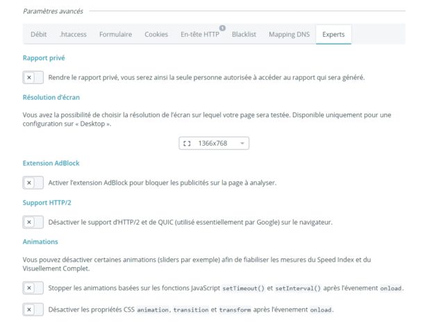 Un des gros avantages de Dareboost : la grande richesse des paramètres qu’il propose pour son outil de test.