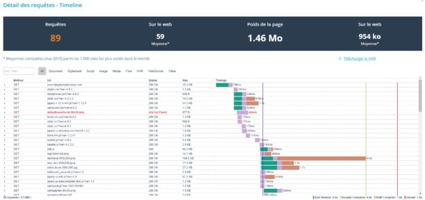 Derrière ce comparatif, les rapports détaillés de chacun des deux tests restent accessibles et permettent, par exemple, de consulter la fonction « Timeline Waterfall ». Vous pourrez ainsi accéder au temps de chargement de chaque requête et filtrer celles-ci grâce aux différents filtres disponibles, pour une analyse en profondeur.