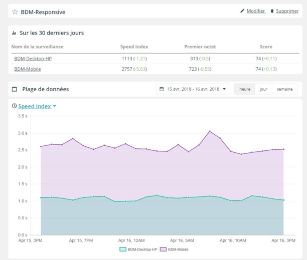 Enfin, Dareboost propose aussi une fonctionnalité de monitoring afin de surveiller l’évolution dans le temps de la vitesse de vos pages (et/ou celles de vos concurrents ) en automatisant vos tests sur la fréquence de votre choix (de 24h à 15min). Dareboost met alors les données récoltées à votre disposition sous la forme de graphes de surveillance paramétrables selon vos besoins.