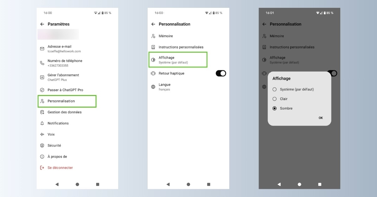 Comme la plupart des sites et applications, ChatGPT présente une interface claire par défaut, car la plateforme privilégie en premier lieu la lisibilité. Mais, comme la plupart des sites et applications, un dark mode peut être activé dans les paramètres. Voici comment faire sur mobile :