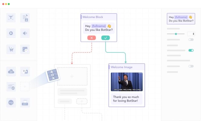 BotStar permet de créer des chatbots à partir de plus de 70 modèles prêts à l’emploi qui peuvent être personnalisés. Ces chatbots peuvent être intégrés dans le contenu d’une page, sous forme de pop-up ou sur une page de destination complète ou sur un chat en direct classique. Il permet aussi de gérer des live chat, avec une boîte de réception omnicanale pour gérer les interactions clients du site web, de Facebook Messenger, WhatsApp… La solution est complète et permet même aux développeurs d’intégrer des fonctionnalités avancées s’ils le souhaitent.