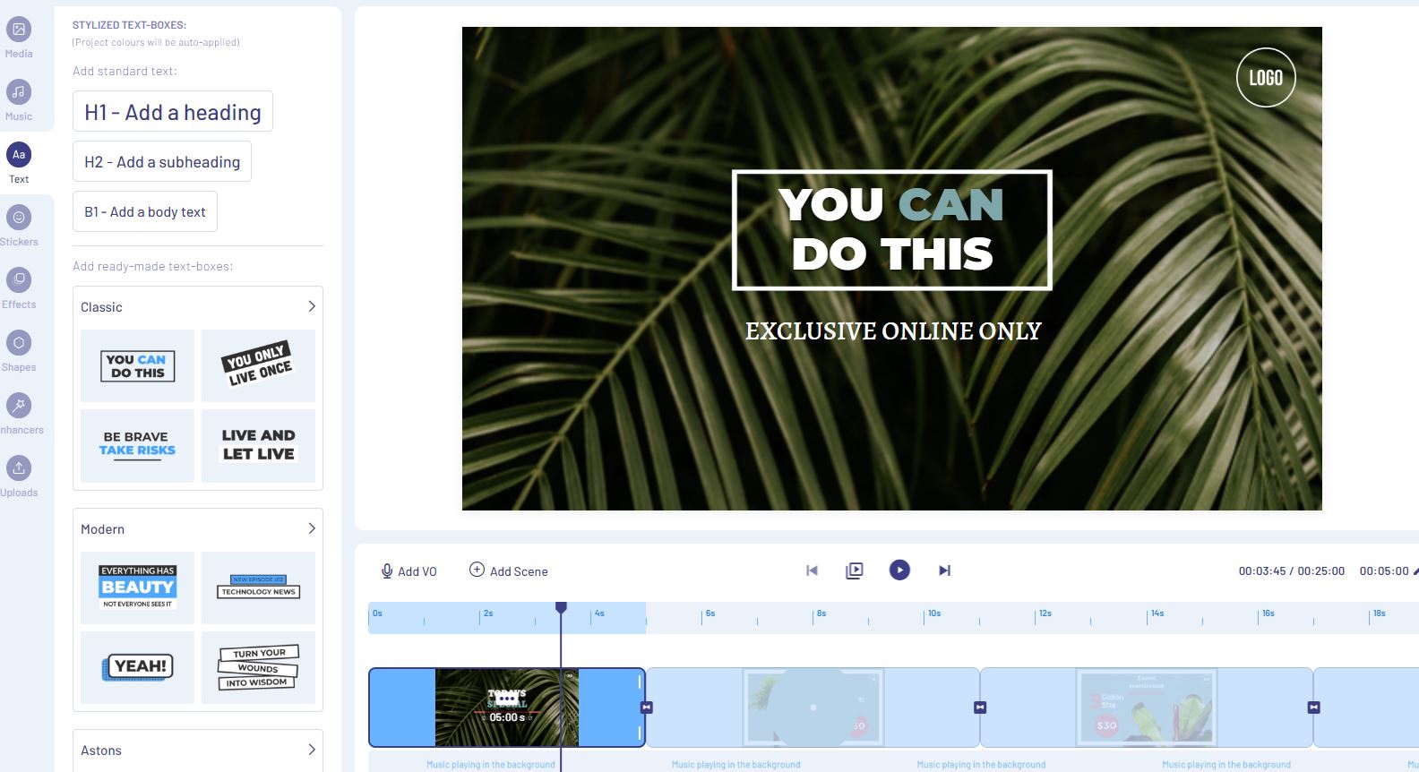 InVidéo permet de créer des vidéos, sans avoir de compétences techniques particulières. Vous pouvez vous appuyer sur des centaines de templates vidéo à disposition : introduction de logo, promotion d’une marque, présentation d’un produit, promotion d’un webinar, témoignages clients, invitation à un événement, etc. Les modèles s’adaptent aux différents formats des réseaux sociaux. InVideo offre les fonctionnalités essentielles pour obtenir des vidéos avec un rendu professionnel.
