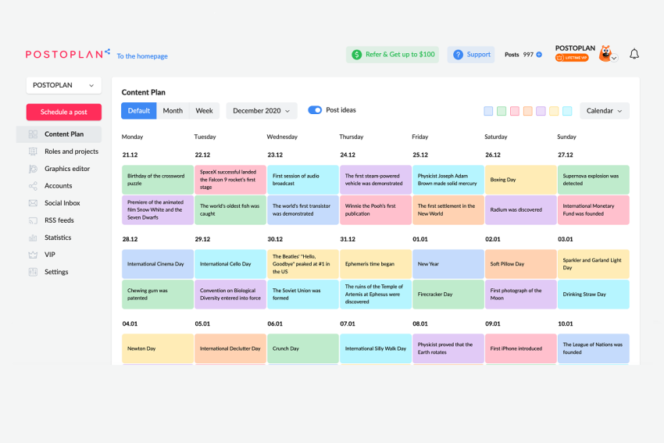 Postoplan est un outil qui permet de gérer la programmation des contenus pour Facebook, Twitter, Instagram, LinkedIn mais aussi de gérer ses messageries WhatsApp, Telegram, Slack et Google My Business. Côté gestion, il est possible de publier simultanément le même contenu sur plusieurs comptes, un calendrier visuel permet une meilleure organisation. La plateforme est collaborative, avec la possibilité de gérer les droits et les accès de chaque membre.