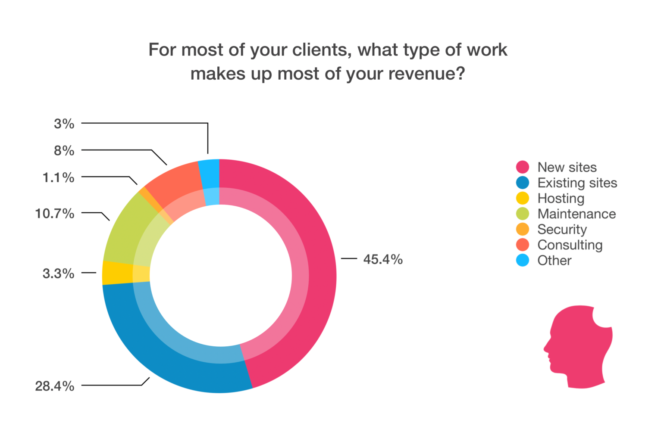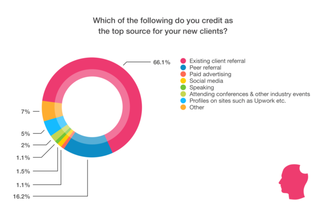 Sur la question des clients, 50% des développeurs indiquent en avoir plus de 11. Concernant les développeurs à leur compte, un peu plus de 80% d’entre eux accordent une attention particulière aux recommandations pour démarcher de nouveaux clients. 66% des développeurs WordPress interrogés considèrent que leurs clients actuels sont leur principale source de nouveaux clients. Le réseau professionnel (les pairs) jouent également un rôle important pour obtenir de nouveaux contrats.